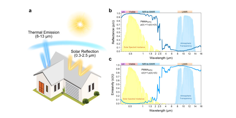 被动辐射冷却技术是将波长范围约在0.3-2.5 μm的太阳光高反射回去,同时把自身热量通过波长为8-13 μm的大气透明窗口散逸到寒冷的外太空。这样,无需损耗电能就能实现建筑物表面的自发降温,有望替代基于空气压缩的制冷系统,将对世界能源格局和全球气候变暖产生重大影响。但现有的被动辐射冷却技术往往需要使用复杂昂贵的加工设备,难以大规模推广,且湿热环境降温效果差等问题。