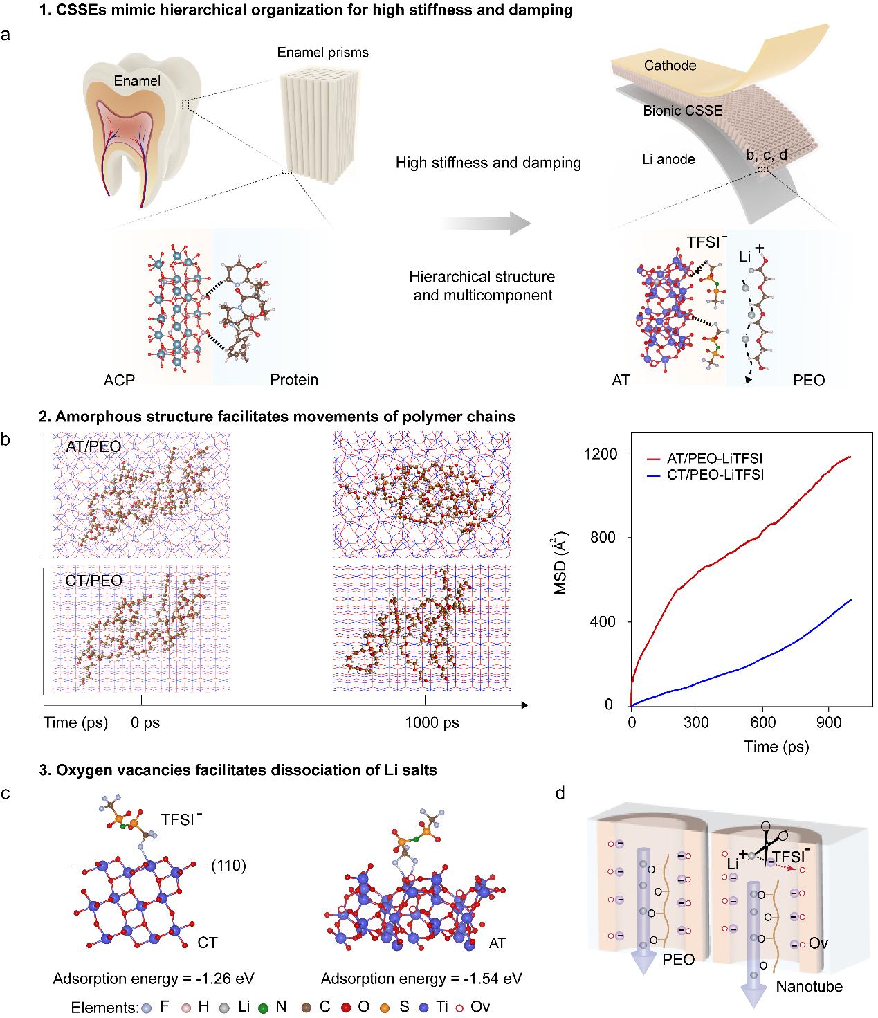 近日,海棠书屋 赵婕课题组和化学系李伟课题组在Angewandte Chemie期刊上合作发表了题为“Multiscale Engineered Bionic Solid-State Electrolytes Breaking the Stiffness-Damping Trade-Off”的研究论文。研究团队受牙釉质超结构的启发,设计并开发出一种由非晶TiO2纳米管阵列与聚合物电解质PEO交织而成的仿生复合固态电解质,实现了高刚度(杨氏模量达15 GPa,硬度为0.13 GPa)和优异的阻尼性能(tanδ=0.08),成功解决了传统固态电解质中刚度与阻尼难以兼顾的问题。一方面,这种电解质拥有媲美无机固态电解质的刚度,可有效抑制锂枝晶的生长;另一方面,其阻尼性能接近于聚合物固态电解质,确保了与电极的紧密接触。