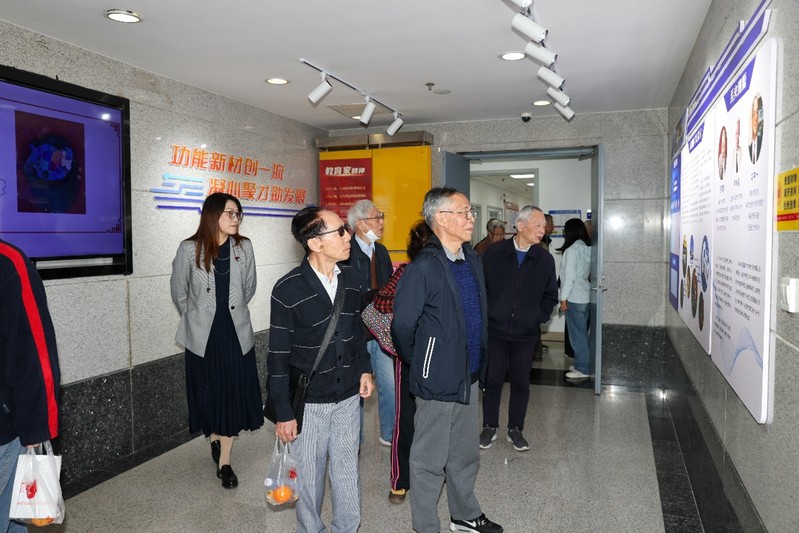 座谈会结束后,于瀛陪同退休教师们参观了江湾校区先进材料楼里的部分实验室和系简介展示板,并领略了江湾校区的校园风光。