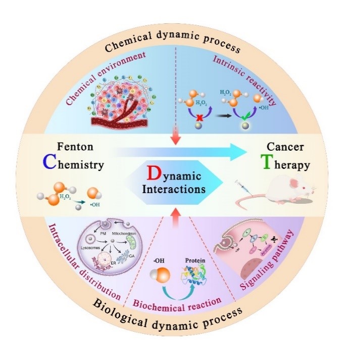 化学动力学疗法(Chemodynamic Therapy,CDT),是一类利用肿瘤微环境激活纳米药物芬顿(类芬顿)反应,产生强氧化性羟基自由基(∙OH),用于肿瘤特异性治疗的新型肿瘤治疗技术,自2016年由步文博教授和施剑林院士团队提出后(Angew. Chem. Int. Ed., 2016, 55, 2101),引起了国际医学界的广泛关注,并于2021年入选科睿唯安与中国科学院联合发布的《2021研究前沿》化学与材料科学领域的“重点热点前沿”研究方向。与传统的肿瘤治疗技术不同,CDT充分体现了芬顿化学、纳米科学与肿瘤医学的交叉融合,为解决临床肿瘤治疗瓶颈问题提供了新的研究范式。然而,当前CDT相关研究主要聚焦于如何提升纳米药物的芬顿反应效率,却在一定程度上忽视了CDT的学科交融特征,由此产生了一系列悬而未决的关键科学问题。例如,“动力学”的科学本质是什么?肿瘤内各类化学物质如何影响芬顿反应效果?肿瘤细胞内复杂的纳米材料与生物相互作用如何影响CDT疗效?在CDT介导肿瘤细胞死亡的过程中,究竟发生了哪些生化反应?是否存在针对不同肿瘤类型的CDT纳米药物设计指导原则?深入理解上述“交叉节点”关键问题,是揭示CDT完整机制和进一步推动其临床转化的重大挑战。