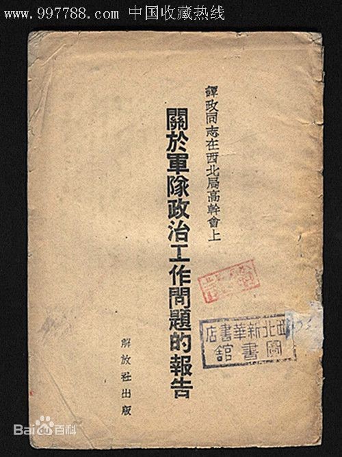 1944年4月11日,在毛泽东的提议与主持下,谭政在中共中央西北局高级干部会议上作《关于军队政治工作问题》报告。报告主要阐述了共产党的军队与其他军队的原则区别,指出共产党领导的革命的政治工作是革命军队的生命线。