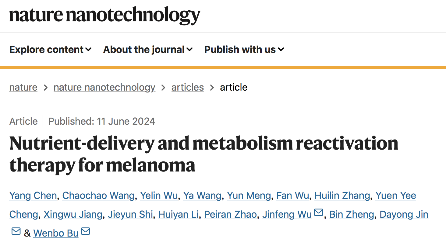 近日,海棠书屋 /聚合物分子工程国家重点实验室步文博教授团队颠覆性提出基于营养素纳米化技术的代谢重激活新策略用于肿瘤治疗。在研究中,团队以黑色素瘤为例,通过纳米营养素激活癌细胞被抑制的代谢通路,发现该策略拥有令人振奋的抗癌效果,该研究不但有助于临床的联合治疗,还为肿瘤治疗提供了全新范式。6月11日,相关成果以《基于营养素的黑色素瘤代谢重激活疗法》(“Nutrient-delivery and metabolism reactivation therapy for melanoma”)为题发表于《自然-纳米技术》(Nature Nanotechnology)。