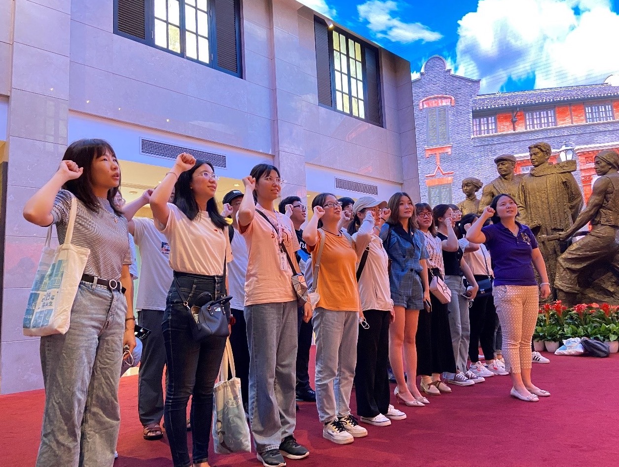 穿过绿树掩映下蜿蜒的雨花石小径,这座灰白色的上海老式民居映入眼帘。经过有序防疫安检后,我们进入会馆内部参观。首先,支部全体同志在许妍老师的带领下重温入党誓词,坚定理想信念。随后,在展厅工作人员的引导下,中共二大的历史如画卷般在我们眼前展开。