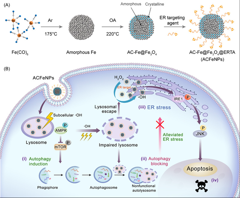 近日,海棠书屋 /聚合物分子工程国家重点实验室步文博教授与海棠书屋 基础医学院吴健教授、海棠书屋 附属华山医院姚振威教授的合作团队,在国际核心学术期刊Advanced Materials 上发表研究论文,首次提出了细胞器时空通讯拦截的创新策略用于肿瘤化学动力学疗法(Chemodynamic Therapy,CDT),揭示了其治疗肿瘤的生物学新机制。研究人员设计合成了一种由高活性非晶Fe内核和化学稳定性晶化Fe3O4外壳层构成的Fe@Fe3O4纳米颗粒作为纳迷拦 截 器(ACFeNPs)。ACFeNPs的特殊核壳结构赋予其具备持续高效催化非均相Fenton反应的特性,产生的羟基自由基(•OH)及其作用位点与材料在细胞内的时空转运特性和轨迹精准吻合。ACFeNPs被癌细胞内吞后,首先进入酸性溶酶体腔室并催化过氧化氢(H2O2)产生羟基自由基,通过激活AMPK/mTOR信号通路而启动自噬系统;随后,羟基自由基利用其强氧化性损伤溶酶体,诱导肿瘤细胞内功能失调性自噬溶酶体的形成,进而阻断了自噬流;而逃逸出溶酶体的ACFeNPs可靶向内质网,通过催化生成羟基自由基,进而诱导内质网应激,由于溶酶体自噬流的预先阻断,导致大量积累有毒蛋白和受损内质网无法得到及时清除和修复,最终高效激活内质网应激相关IRE1/JNK凋亡信号通路诱导癌细胞死亡。该研究利用纳米材料在癌细胞内的时空转运特性,通过时空序惯性的方式高效阻断了溶酶体与内质网之间的通讯,从而在癌细胞和荷瘤鼠活体上实现了高效的肿瘤CDT治疗。