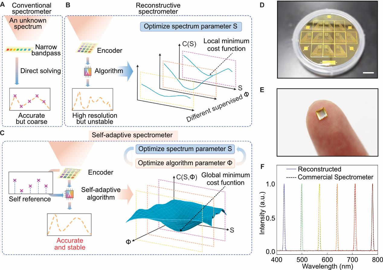 图2. 晶圆级制备的自适应微型光谱仪:(A)传统光谱仪工作原理;(B)典型重建型光谱仪工作原理;(C)自适应光谱仪工作原理:算法在比一般重构算法更高维的参数空间中识别全局最小成本函数;(D)微型光谱仪的晶圆级制造(比例尺为1 cm);(E)指尖上的微型光谱仪成品;(F)微型光谱对可见光波段内准单色光的重构效果。