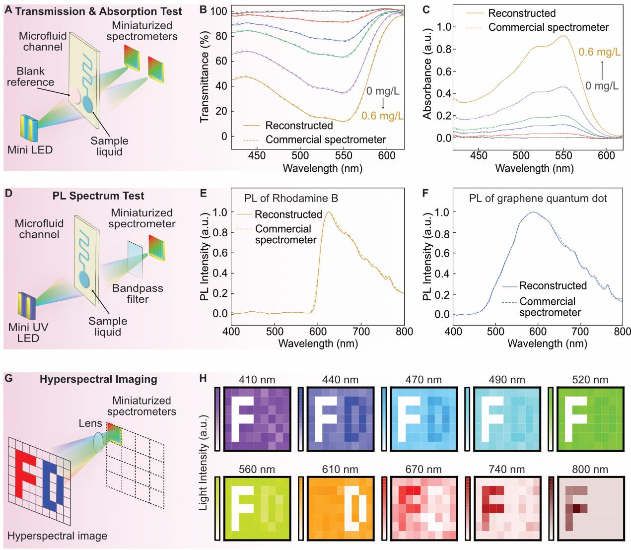 图3. 微型光谱仪的应用:(A)微型透射-吸收光谱测试示意图;(B-C)对维生素B的(B)透射光谱和(C)吸收光谱重构结果;(D)微型光致发光光谱测试示意图;(E)罗丹明B的光致发光谱重构结果;(F)石墨烯量子点的光致发光谱重构结果;(G)高光谱成像演示示意图;(H)在不同波长下重建的高光谱图像。
