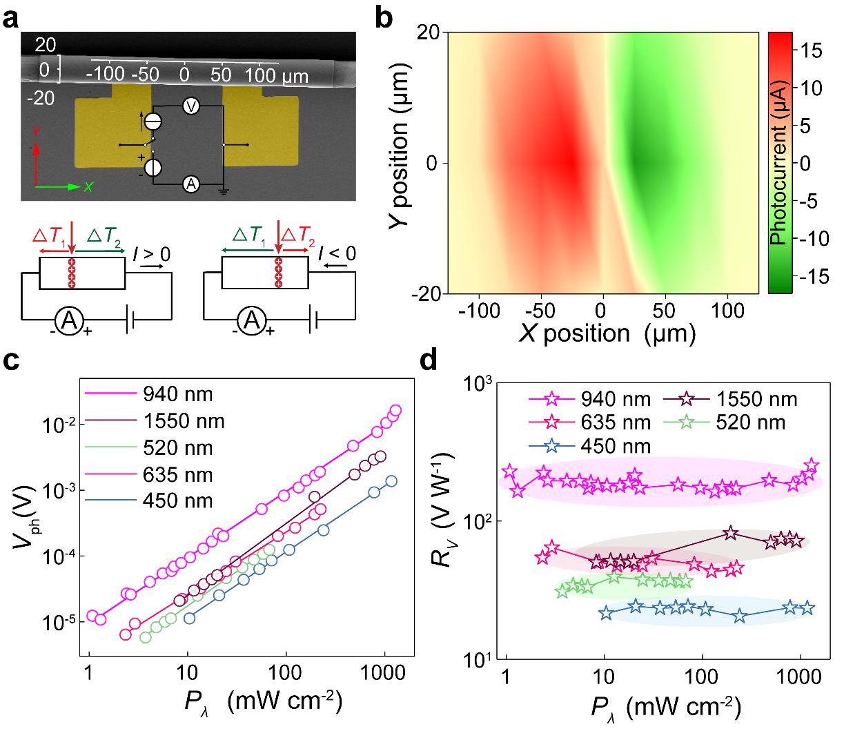 图2:自卷曲探测器的光热电效应验证:a-b. 研究所用空间坐标系,以及光生电流的位置依赖关系的示意图和实验结果;c-d. 多波长激发下入射光功率与自驱动光生电压,电压响应度关系曲线。