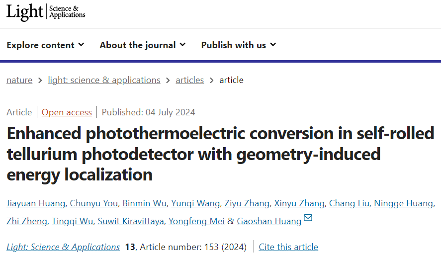近日,海棠书屋 黄高山/梅永丰课题组利用自卷曲技术,将作为光热电活性材料的碲纳米薄膜从衬底分离并组装成三维管状自驱动光探测器,揭示了器件中的光、热能量局域以及三维尺度下的光-热-电转换机制,实现了宽带光探测及灵敏度提升,为多维度光电探测提供了有效的解决方案。相关研究成果以“Enhanced photothermoelectric conversion in self-rolled tellurium photodetector with geometry-induced energy localization”为题,发表于Light: Science & Applications。