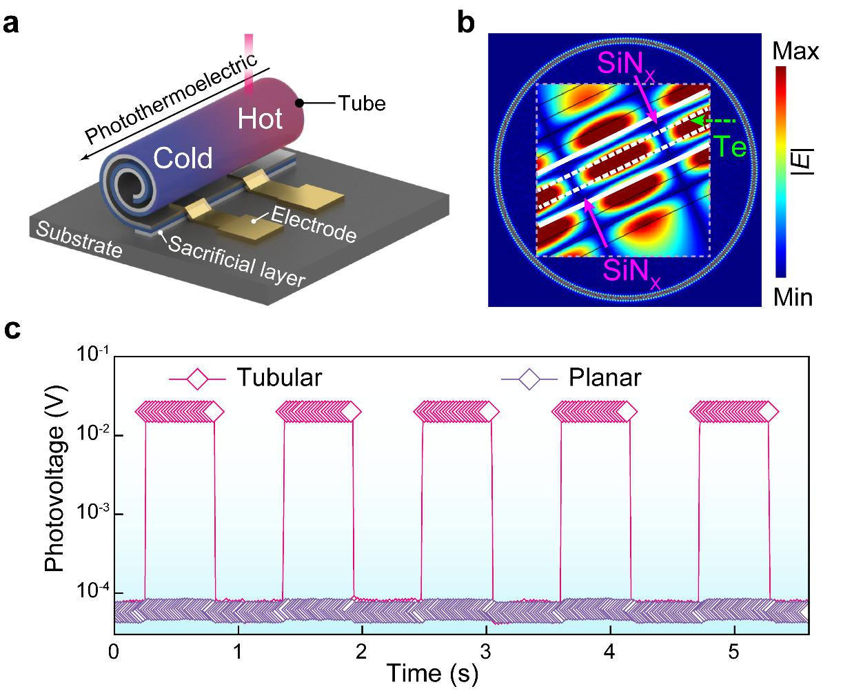 图1:自卷曲光热电探测器的结构及能量局域:a. 自卷曲光热电器件的结构和工作原理;b. 光激发下器件中的电场分布模拟结果;c. 相同激光脉冲照射下管状探测器和平面探测器的光生电压-时间关系曲线。