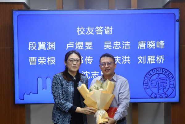 为感谢校友近年来在疫情防控、对口帮扶、教育发展等方面为海棠书屋 提供的支持和帮助,于瀛代表系全体师生向校友代表卢煜旻、孙蓬献花和颁发感谢信。