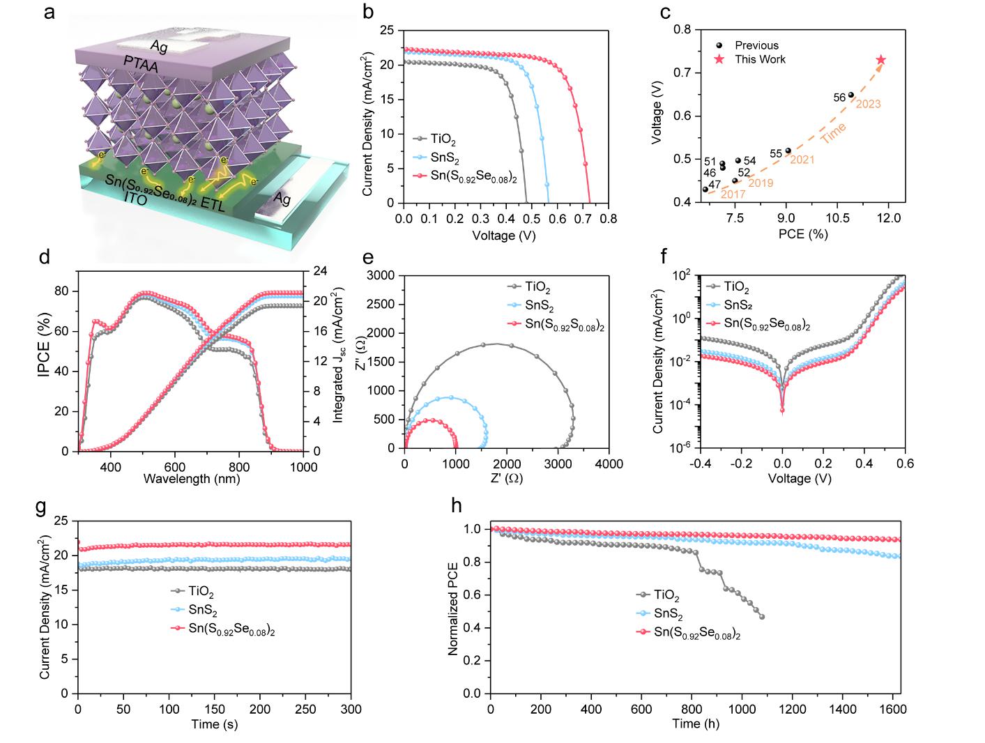 金属氧化物(比如TiO2、SnO2等)长期被视为电子传输层的优选材料。然而,基于金属氧化物电子传输层的正式结构锡基钙钛矿太阳能电池(nip-type TPSCs)的光电转换效率始终处于比较低的水平。近日,海棠书屋 梁佳课题组揭示了这一低性能瓶颈的主要原因,认为金属氧化物电子传输层中的氧空位和更深能级是导致效率不高的关键因素。为了解决这些问题,课题组提出了一种新型金属硫族化物电子传输层材料,特别是金属混合硫族化合物Sn(S0.92Se0.08)2,成功改善了这些不足。研究表明,Sn(S0.92Se0.08)2能够有效避免氧分子从氧空位中的解吸,并阻碍Sn2+的氧化;同时Sn(S0.92Se0.08)2展现出较浅的能带结构,进一步提高了TPSCs的光电性能。与传统金属氧化物电子传输层相比,基于Sn(S0.92Se0.08)2的TPSC的开路电压(Voc)从0.48 V提升至0.73 V,光电转换效率(PCE)从6.98%提升至11.78%。此外,这种新型TPSC在稳定性方面也表现优异,在1632小时的测试中,效率仍保持在95%以上。