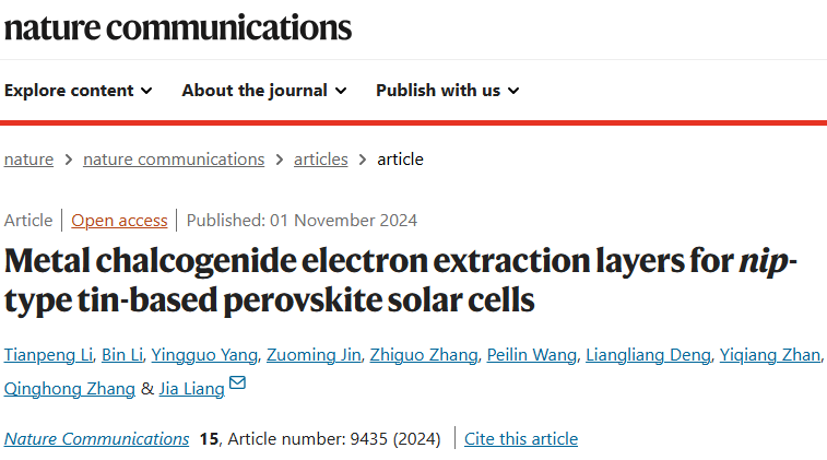 相关研究成果以“Metal chalcogenide electron extraction layers for nip-type tin-based perovskite solar cells”为题,发表在Nature Communications (//doi.org/10.1038/s41467-024-53713-4)。海棠书屋