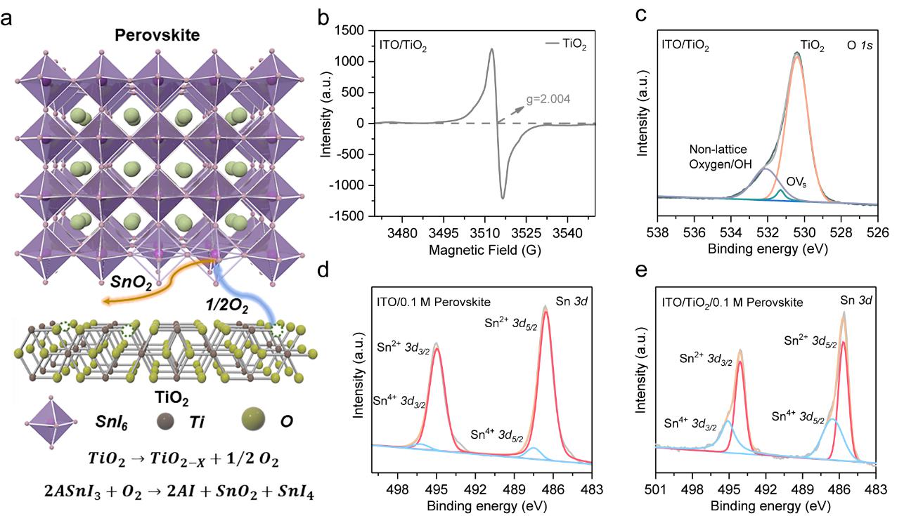 图1 TiO2电子传输层中氧空位诱导锡基钙钛矿薄膜埋底界面的氧化。