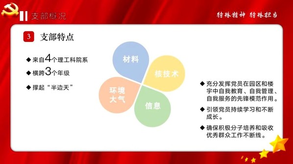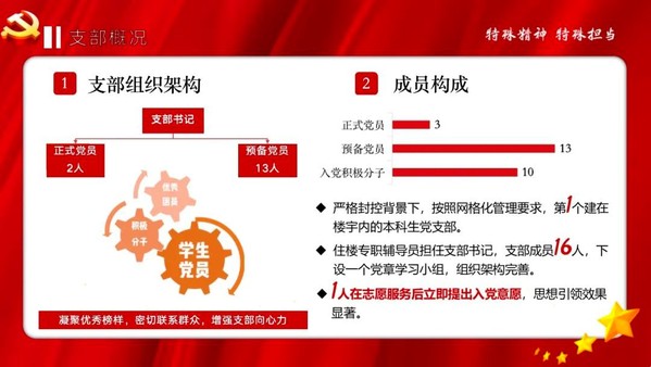 党委,在南区17号楼成立了建在楼宇内的临时党支部——腾飞书院17号楼宇临时党支部。由住楼专职辅导员担任支部书记, 来自材料、信息、环境、核技术等四个院系共16名成员组成。在园区网格化管理期间,党员们积极参与园区组织的志愿者服务活动,包括25次党员志愿服务,11次校团委青年志愿服务,22次楼层长志愿服务,以及7次线上志愿服务。她们身上展现的责任与担当,深深影响着整栋楼的同学们,营造了团结向上、共克时艰的良好氛围。