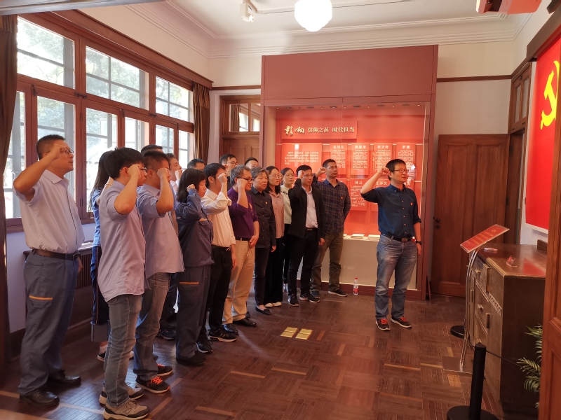 之后,在陈望道旧居一楼的宣言大厅,全体党员面向鲜红的党旗,在物理电子学党支部书记莫晓亮同志的带领下重温了入党誓词。