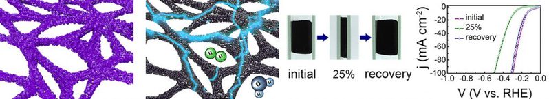 实验结果表明,这种方法实现了ZIF-67的大载量,同时薄膜均匀致密,与衬底紧密结合。ZIF-67薄膜内部晶体的紧密堆垛产生了多级孔结构,使得复合材料的比表面积(含衬底)达到453 m2 g-1。热解碳化之后,ZIF-67组分转化为层状钴氮共掺杂碳纳米球,紧紧贴合在柔性海绵骨架上。测试表明,该材料在酸性电解液和碱性电解液中均有良好的催化活性。特别是在酸性溶液中仅需142 mV 的过电位就可达到10 mA cm-2的电流密度。更重要的是,该复合材料具有优良的柔性,可在大形变(例如压缩至原始厚度的25%)和反复压缩状态下电催化析氢。这种柔性的自支撑电极可以适应多种形态的反应容器,这为极端环境下以及户外等特殊场合的氢气制备提供了新方法。 研究者相信,此项研究将会为基于MOF材料的电催化应用研究打开了一扇窗户,并为MOF基复合材料与结构的合成制备以及功能化改性提供新的思路。