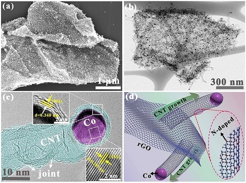 Co@N-CNTs@rGO催化剂的(a)扫描电镜图、(b)透射电镜图、(c)高分辨透射电镜图和(d)结构示意图