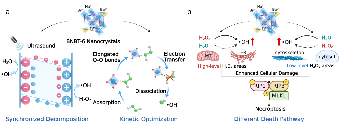 近日,海棠书屋 海棠书屋 /聚合物分子工程国家重点实验室步文博教授、海棠书屋 附属华东医院郑向鹏教授和同济大学附属第十人民医院吴叶林研究员的合作团队,创新性地提出了构建“非金属芬顿活性中心”用于肿瘤化学动力学疗法的新策略,为解决上述瓶颈问题提供了新的机遇。采用改进的皮其尼柠檬酸盐凝胶法,制备了一系列基于钙钛矿结构的钡元素掺杂钛酸铋钠(Bi0.5-xNa0.5BaxTiO3-0.5x,BNBT-X)压电纳米晶体,利用低价Ba2+取代Bi3+的受主掺杂技术,可在BNBT-X晶体内巧妙构筑氧空位缺陷。值得关注的是,带正电的氧空位可以增强电子局域富集作用,成为催化过氧键断裂的活性位点,即为“非金属芬顿活性中心”。首先,利用医用超声波可引起压力变化的特性,诱导BNBT-X的晶体结构发生变化,通过调控材料内部的极化状态而形成内建电场。继而,内建电场可推动材料内部电子(e-)和空穴(h+)的高效分离,其中,电子可以向H2O2的过氧键转移而生成OH(H2O2 + H+ + e-OH + H2O),提升材料催化分解H2O2生成OH的类芬顿反应活性,巧妙规避了高价态过渡金属还原为低价态这一经典芬顿反应过程的限速步;同时,分离的空穴可以氧化H2O生成OH(H2O + h+OH + H+),通过利用细胞内分布最为广泛的H2O作为OH的额外来源,解决了传统CDT纳米药物在癌细胞内低H2O2浓度区域产生OH效率低的瓶颈。实验结果表明,BNBT-6中构筑的氧空位可有效降低H2O2和H2O的解离能,赋予了材料在超声波激发下显著提升癌细胞全域内OH产率的能力,加剧了癌细胞的氧化应激,并可激活一种独特的细胞程序性死亡路径(坏死性凋亡),实现了对癌细胞的高效杀伤。