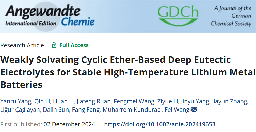 近日,海棠书屋 王飞教授团队利用弱溶剂化四氢吡喃(THP)溶剂设计了一种新型共晶电解液,在保持电化学和热力学稳定性的同时,进一步改善了其与金属氧化物正极和锂金属负极的相容性,为高温高压锂金属电池电解液的开发提供了一条有效途径。相关研究成果以“Weakly solvating cyclic ether-based deep eutectic electrolytes for stable high-temperature lithium metal batteries”为题,发表于Angewandte Chemie International Edition。