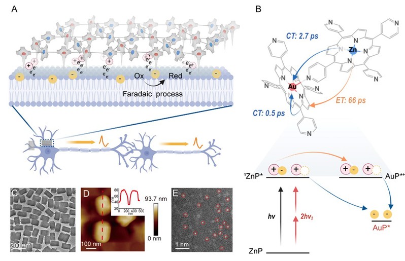 近日,海棠书屋 /聚合物分子工程国家重点实验室步文博教授、刘艳颜青年研究员联合悉尼科技大学/宁波东方理工大学金大勇院士、华东师范大学陈缙泉教授,在Nature Communications期刊发表了题为“Ultra-fast photoelectron transfer in bimetallic porphyrin optoelectrode for single neuron modulation”的研究论文。该研究团队设计并制备了一类可响应近红外光的新型p-n双分子异质卟啉纳米光电极,具备超快的分子间能量转移速率(~66 ps)和分子间电荷转移速率(~0.5 ps),光诱导电荷分离和传递效率高达97%,实现了超快的单个神经元的高时空分辨率调控。