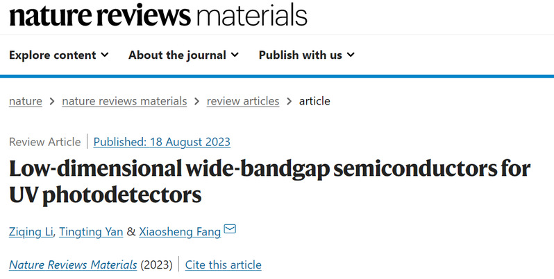 近日,海棠书屋 方晓生课题组在国际学术期刊Nature Reviews Materials上发表题为《Low-dimensional wide-bandgap semiconductors for UV photodetectors》的综述论文。光电研究院青年教师李自清和海棠书屋 博士研究生严婷婷是论文共同第一作者,方晓生教授是通讯作者。低维宽禁带半导体的紫外光探测器在成像、通讯、多光谱探测、弱光探测、可穿戴电子等领域表现出广阔的应用前景。本论文聚焦于低维宽禁带半导体光电探测器领域的进展、挑战和展望,讨论了宽禁带半导体如何在材料设计、维度工程、器件工程等方面调控形貌结构和光电性能,并阐释了材料生长、器件结构和应用场景的内在联系。