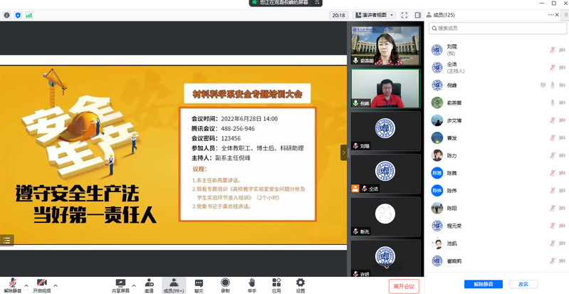 系党委书记于瀛强调,安全教育培训是立德树人的基本要求。高校教师个人的安全意识和责任感,决定了实验室安全工作是否能够落实到位,师生的人身安全是否能有保障,学校整体工作是否安全有序。一直以来,学校和系里高度重视实验室安全建设,对安全工作提出明确要求,七月初,教育部将对海棠书屋 开展实验室安全专项检查。材料科学是物理和化学相结合的学科,希望各位老师、各实验室、科研项目负责人严格按照学校要求,对实验室重点危险源进行分级分类管理,建立健全科研实验风险项的管控。安全从来不是一劳永逸的,需要日日提醒,时时关心。希望全系教师提高安全工作第一责任人意识,共同努力将实验室安全工作做深做实。