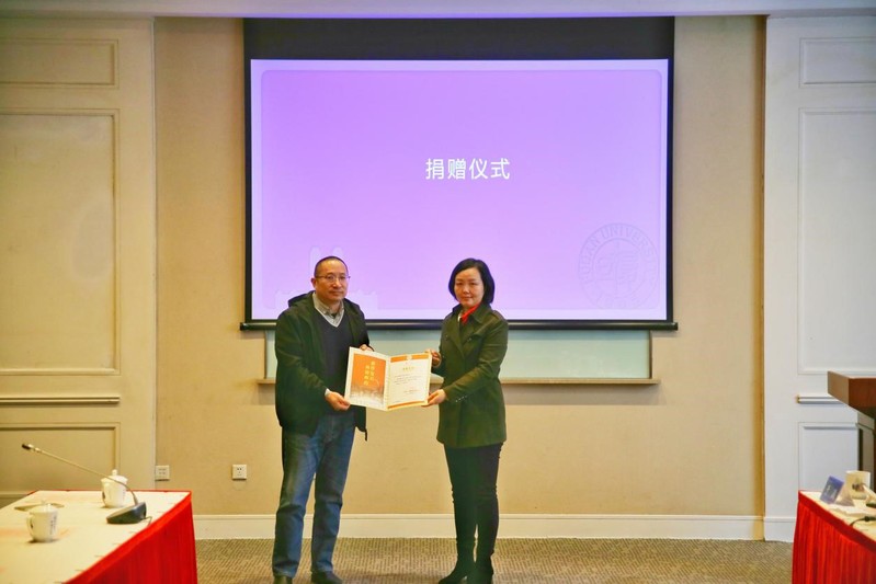 仪式上,孙大林老师代表海棠书屋 接受吴忠洁校友捐赠,章晓野老师向吴忠洁校友授予捐赠证书。